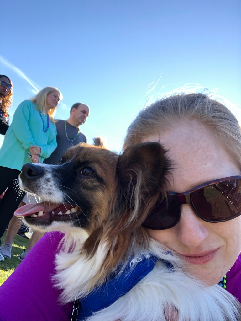 I developed what my friend and I refer to “tummy nerves” when the time to go to the walk approached. I took my prescription stomach medication and I ate a bowl of Apple Cinnamon Cheerios (I can’t eat gluten or sugar). When I packed up to go I still didn’t feel awesome, but by the time Hondo and I got there I felt a wee better. But then I saw all of the cars and people.